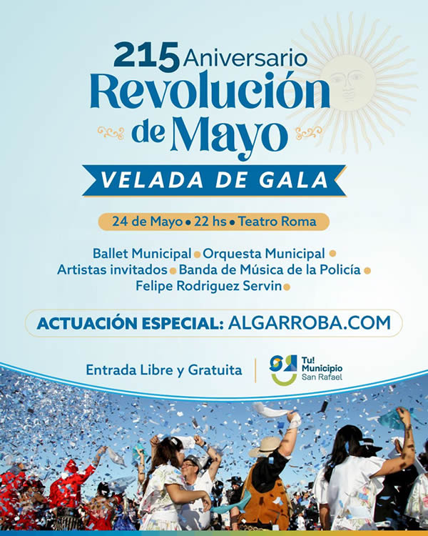 El primer evento oficial será la tradicional “Velada de Gala” que tendrá lugar el próximo sábado 24 de mayo a partir de las 22 horas en el teatro Roma. Allí se desarrollará el espectáculo artístico protagonizado por el ballet y la orquesta municipal, el show de Algarroba.com y la intervención de la Banda de Música de la Policía, a cargo de interpretar el Himno Nacional Argentino cuando lleguen las 12.